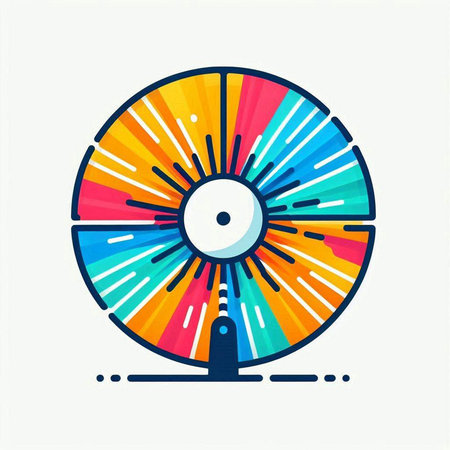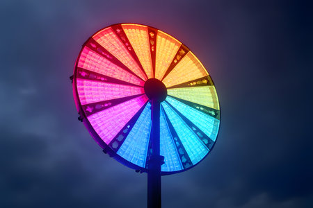 A spinning wheel a vibrant rainbow spectrum with radiating light flares against a stark black background.