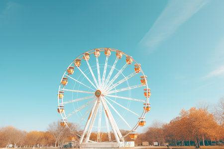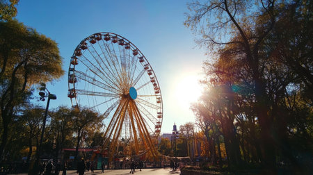 Ferris wheel towers over a sunny park in autumn showcasing vibrant foliage and clear blue skies