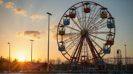 A colorful ferris wheel stands against a bright sunset sky. Structure features orange and yellow cabins, surrounded by green trees