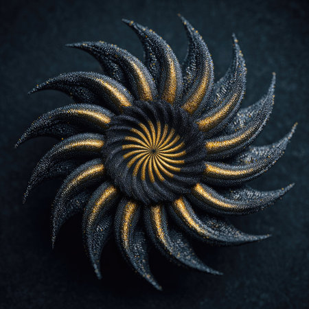 An abstract floral design displays a complex pattern of layered petals. The artwork utilizes dark tones contrasted with gold highlights, creating a captivating visual effect. It is likely created in a digital environment, the detailed construction providing a rich texture. It may be suitable for various commercial uses.