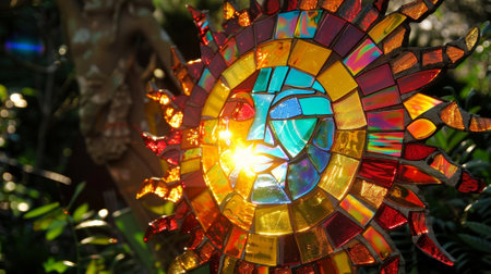 A mosaic sun made from old CDs catching the sunlight and reflecting a rainbow of colors in the garden