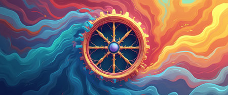 An intricate wheel design, adorned with golden accents, stands out against a vibrant, swirling backdrop of blues, oranges, and yellows. This captivating image evokes a sense of movement and transformation, symbolizing the journey of life and the passage of time.