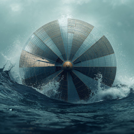 A round metallic object rises above the waves in the ocean. The sky is filled with clouds and the water splashes around the object. Waves crash against the surface.
