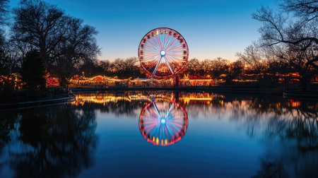 A colorful Ferris wheel reflecting in a calm lake, surrounded by festive lights and trees