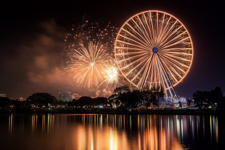 Illuminated ferris wheel with neon lights and fireworks. By generative Ai