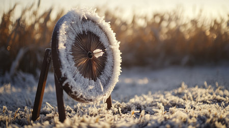 Frost-covered archery target early in the morning, white crystals on rings and stand