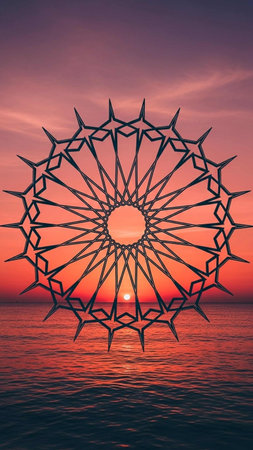 A ferris wheel stands tall against a stunning sunset, with vibrant colors reflecting on the water. The sky glows warm as the sun dips low, creating a peaceful atmosphere.