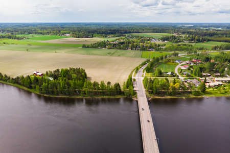 Aerial view on bridge over blue lake in summer day in rural Finland countryside with green and yellow fields