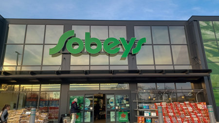 Toronto, ON, Canada – March 30, 2025: The logo and brand sign on Canadian retail business Sobeys grocery store in Toronto