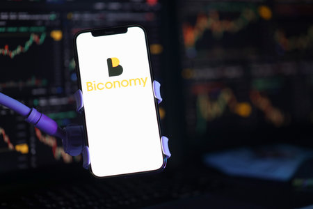 KYIV, UKRAINE - MARCH 15, 2024 Biconomy logo on iPhone display screen and crypto currency value charts. Cryptocurrency exchange portal