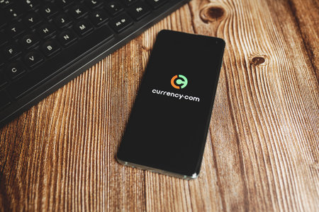 Smartphone with Currency com app logo and black keyboard on wooden background