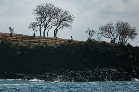 Panorama ocean coastline, green-capped cliff. Indonesia. Spectacular oceanscape the shore surrounded by the grass covered cliffs on the blue sky background. Sumba island, Indonesia.