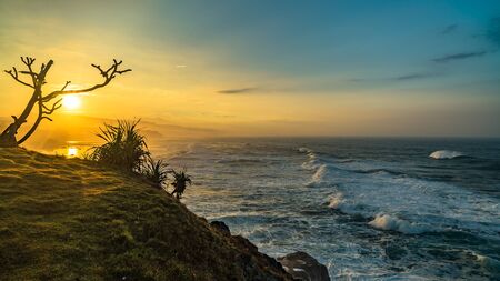 Beautiful views of the soft waves at sunset on the beach from the top of the cliff