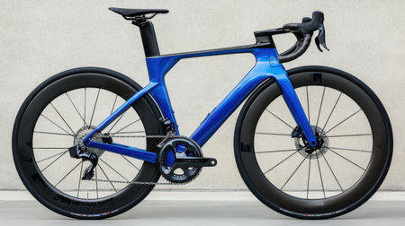 This striking blue racing bicycle showcases a modern design with high-performance components, perfect for cycling enthusiasts and athletes.