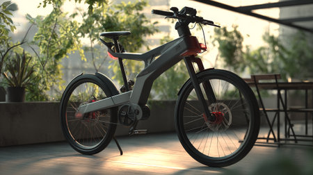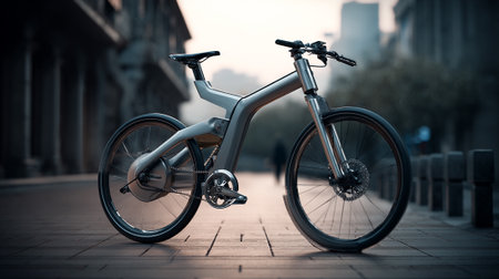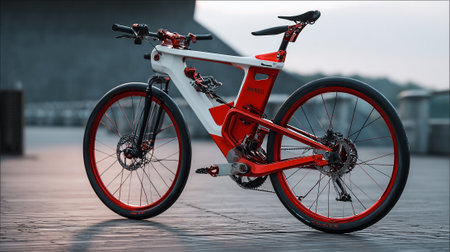 a close-up, uhd image of a bicycle parked on a street with a stunning sunset in the background. the vibrant colors of light crimson and red create a youthful and energetic atmosphere. this landscape-focused photo captures the detail-oriented beauty of the scene. get ready to experience the rtx on effect with this captivating image. ai generated