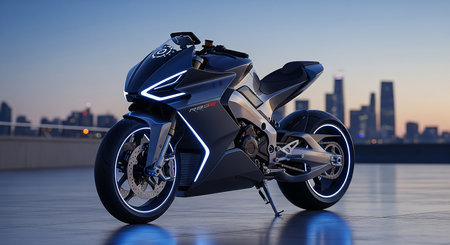 Futuristic Motorcycle with Neon Lights Against Cityscape at Dusk