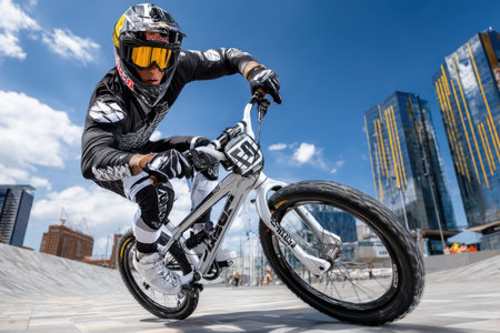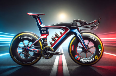 Vibrant bicycle racing on dynamic urban track in creative blurred motion with cityscape background