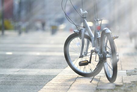 Bike at the summer sunset on the tiled road in the city park. Cycle closeup wheel on blurred summer background. Cycling down the street to work at summer sunset. Bicycle and ecology lifestyle concept.