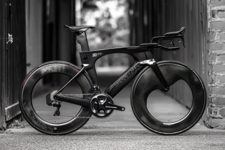 A high-performance racing bicycle stands in a narrow alley flanked by brick walls and wooden doors.