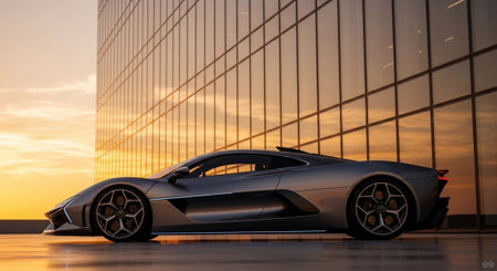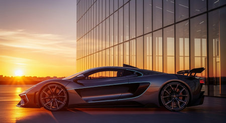 A futuristic silver sports car is parked in front of a contemporary glass building during a golden sunset.