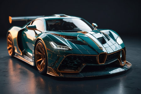 an old race car, reminiscent of the olympus af-1 (also known as olympus infinity), is captured in a striking gold hue. the photograph showcases hyper-realistic water and draws inspiration from the dusseldorf school of photography. with its dramatic lighting and attention to detail, this tabletop image exemplifies the artistry of ultra hd photography and exquisite craftsmanship. ai generated