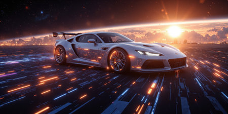 Sleek futuristic car gliding along a sun-kissed road in the golden hour.