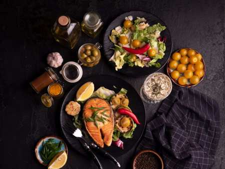 Healthy and diet food concept. Grilled salmon steak, salad with vegetables, olives and wine on black background. Top view, close-up. Red fish with garlic, yellow tomato and spices on black plate.