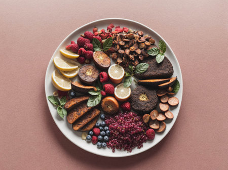 A visually appealing platter showcasing a balanced meal with various colorful fruits, vegetables, proteins, and nuts.
