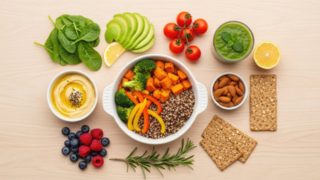 An overhead view displays a diverse selection of fresh food items, including a grain bowl, fruits, and vegetables. The composition features a variety of colors and textures against a light wooden surface. This arrangement is suitable for use in health-related publications and commercial projects.