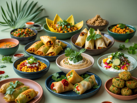 A table displays a lavish assortment of plant-based dishes in colorful bowls, showing a vibrant and delicious vegan spread.