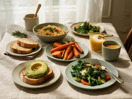 Vibrant plates filled with fresh fruits, vegetables, and wholesome grains create a beautiful breakfast spread.