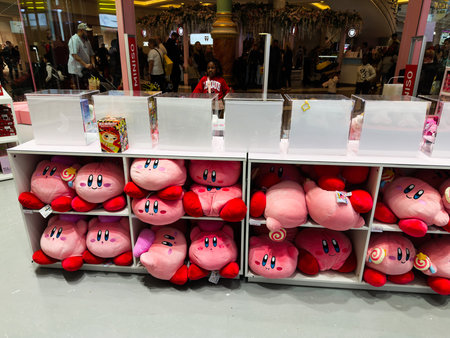 Stretford, UK - November 15, 2025: Colorful pink Kirby plush toys on shelves in a busy Manchester Miniso store with shoppers nearby.