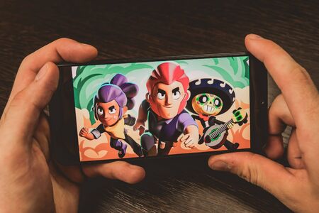 April, 2019. Kramatorsk, Ukraine. Clash Royale gameplay on a white smartphone in hand