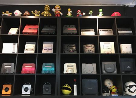 BANGKOK - DECEMBER 2017: Many vintage video game consoles for sale in Pantip Plaza.