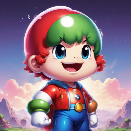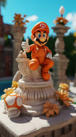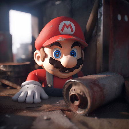An AI generated illustration of A digital illustration of a classic video game character, Mario, holding a broken wooden plank