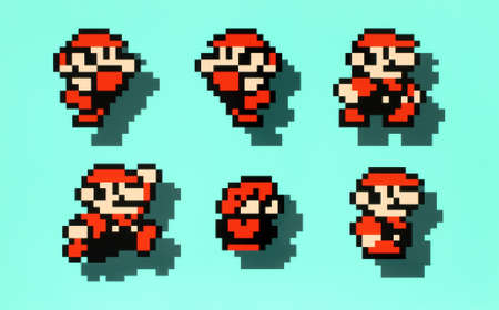 Kyiv, Ukraine - September 27, 2021: Set of Mario moves, art of Super Mario Bros 3 classic video game, pixel design, printed on paper. Super Mario Bros 3 is a platform video game developed by Nintendo