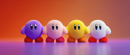 Four soft plush toys in vibrant colors stand together against a colorful background inviting play and imagination in a joyful setting.