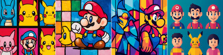 vector: A pop‑art vector collage featuring iconic gaming icons such portrayed in diverse styles, from grid panels and mosaic backgrounds to low‑poly avatars.