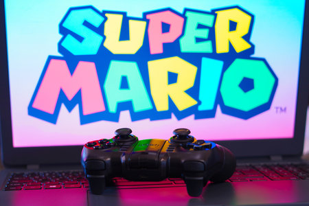 February 5, 2024, Brazil. In this photo illustration, the Super Mario game logo is displayed on a computer screen, next to a gamepad