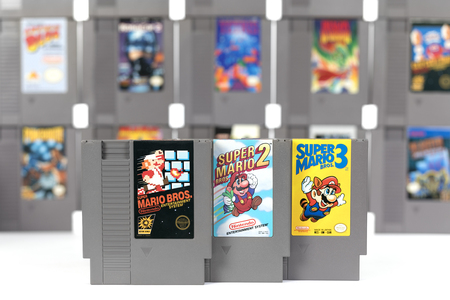 Taipei, Taiwan - February 20, 2018: A studio shot of a the three Nintendo NES Super Mario games in front of other games on a white background.