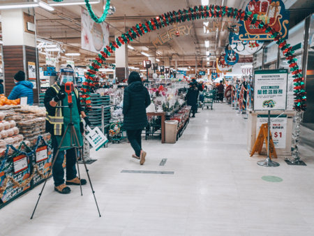 Toronto, Ontario, Canada - December 19, 2020: Store worker measures customers temperature with non-contact infrared thermometer. Covid-19 safety precaution against coronavirus spread.