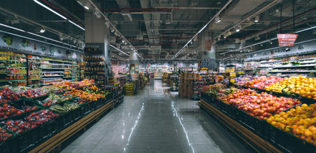 A wide angle shot depicts a well-lit grocery store interior. Shelves overflow with vibrant fresh produce. The scene showcases an aisle with symmetrical rows and overhead lighting. The composition suggests potential use for commercial content related to food, retail, or health.