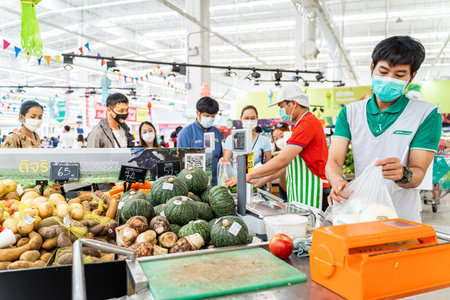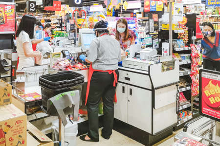 KANCHANABURI, THAILAND - APRIL 6,2020: Unidentified Cashier or supermarket staff and customers in medical protective mask