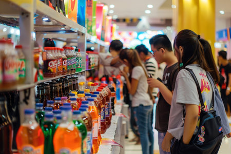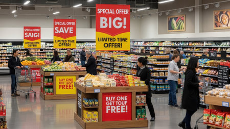 Inside a well-lit grocery store, customers explore the product displays. The scene features various aisles, shelves stocked with goods, and overhead lighting. It could be used for illustrating shopping habits, consumerism, or commercial projects.