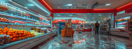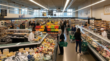 A wide-angle view captures a bustling supermarket interior. Customers peruse various food displays with colorful products. The composition features overhead lighting, creating a bright atmosphere. This image is suitable for commercial use, showcasing retail environments, and illustrating consumerism.