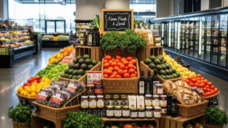 Abundance of food and wine bottles in a modern retail store generated by artificial intelligence