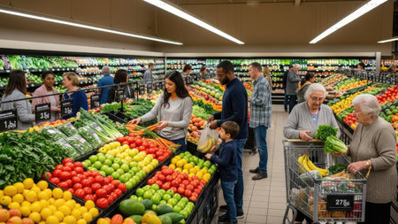 A well-lit interior scene depicts a grocery store with various shoppers browsing through products. The composition showcases shelves, displays, and promotional signs. The setting indicates a retail environment with a focus on fresh produce and packaged goods. The image could serve for commercial purposes.