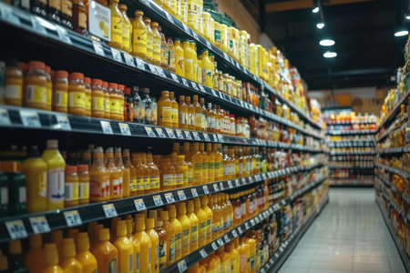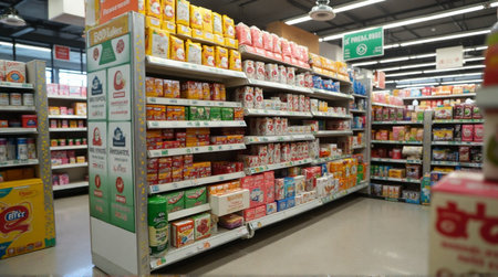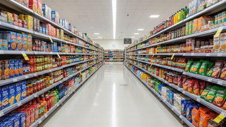Perspective view of a grocery aisle with shelves stocked with colorful products in a modern supermarket setting. Represents retail and consumer choices.