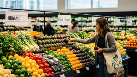 A woman browses a vibrant display of fresh fruits and vegetables at a grocery store. The scene showcases a variety of colorful produce under bright lighting. This image suggests a focus on healthy eating, food shopping, and the importance of organic choices. Suitable for illustrating wellness, nutrition, and lifestyle content.