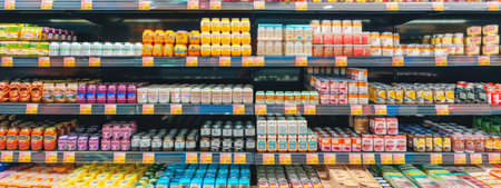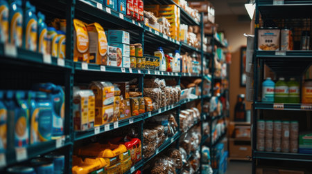 A well-stocked supermarket aisle filled with a variety of products, showcasing the abundance and variety available in modern retail stores.